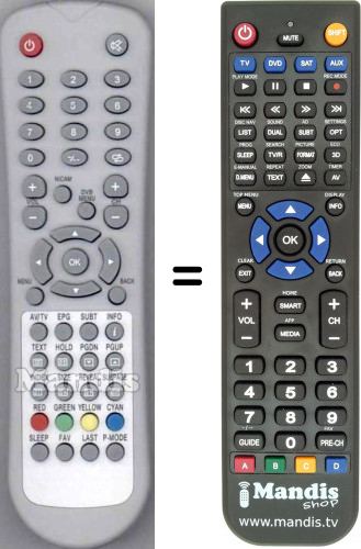 Cette télécommande remplit toutes les fonctions de la télécommande d'origine: Power, Mute, 1, 2, 3, 4, 5, 6, 7, 8, 9, 0, -/--, Recall, Vol +, Vol -, Nicam, DVB Menu, CH +, CH -, Up, Left, OK, Right, Down, Menu, Back, AV / TV, EPG, Subt, Info, Text, Hold, Pg Dn, Pg Up, Index, Size, Reveal, Subpage, Red, Green, Yellow, Cyan, Sleep, FAV, Last, P-Mode