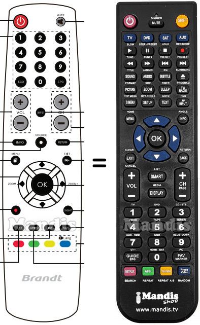Ci-dessous, nous vous montrerons la correspondance entre chaque bouton de la télécommande d'origine et le bouton qui effectue la même fonction sur la télécommande de remplacement. Dans certains cas, vous devrez peut-être appuyer sur la touche SHIFT avant d'appuyer sur un autre bouton pour effectuer certaines actions. Ces fonctions supplémentaires sont souvent peu utilisées et sont incluses pour faciliter la compréhension de la télécommande de remplacement, ou parce que la télécommande d'origine comporte plus de boutons que son équivalent.