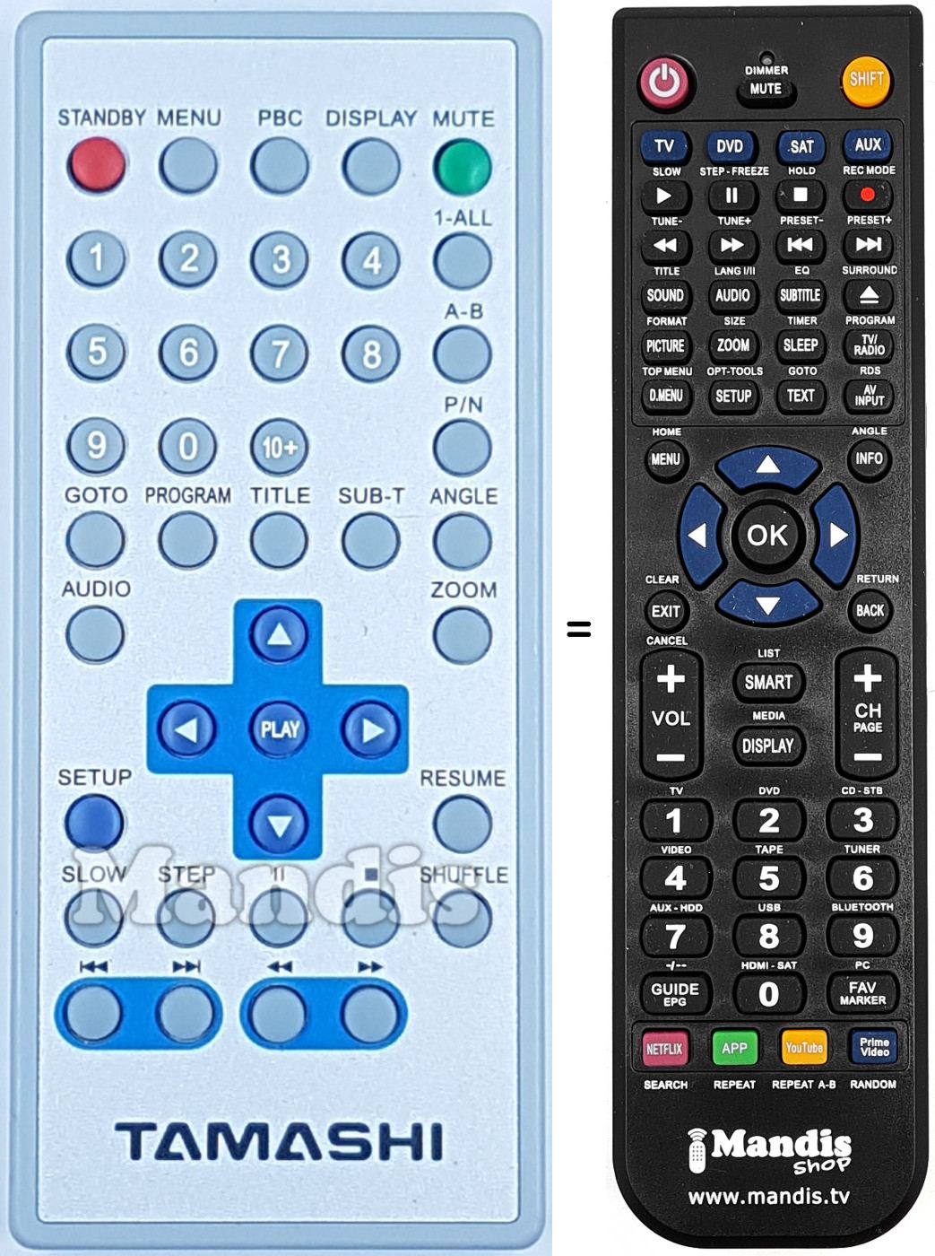 La télécommande équivalente exécute toutes les fonctions, même lorsque la télécommande d'origine commande divers appareils. Dans la télécommande équivalente, est possible de programmer différents appareils (TV, DVD, SAT et AUX) de manière à pouvoir inclure toutes les fonctions de la télécommande d'origine. Si vous voyez le manuel des touches (instructions de la télécommande), vous pouvez vérifier que toutes les fonctions sont présentes.