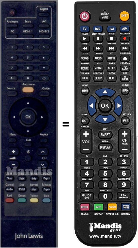 Télécommande qui remplace celle d'origine car elle possède les mêmes fonctions. Il ne s'agit pas d'une télécommande universelle mais d'une télécommande qui remplace celle d'origine. Vous recevrez la télécommande prête à fonctionner, vous n'aurez qu'à mettre les piles. Il n'est pas nécessaire de la programmer. Nous vous garantissons que la télécommande aura exactement les mêmes fonctions que celle d'origine.