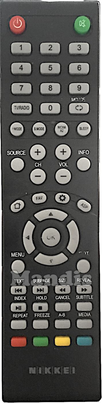 Power, Mute, 1, 2, 3, 4, 5, 6, 7, 8, 9, 0, TV / Radio, Recall / Mouse, P.Mode, S.Mode, Nicam / A2, Sleep, Source, CH+, CH-, Vol+, Vol-, Info, Home, Fav, Settings, ASP, Up, Left, OK, Right, Down, Menu, Exit, I<< / Text, >>I / Subpage, << / Size, >> / Reveal, Play/Pause / Index, Stop / Hold, Cancel, Subtitle, Repeat, Freeze, A-B, Media, Red, Green, Yellow, Blue