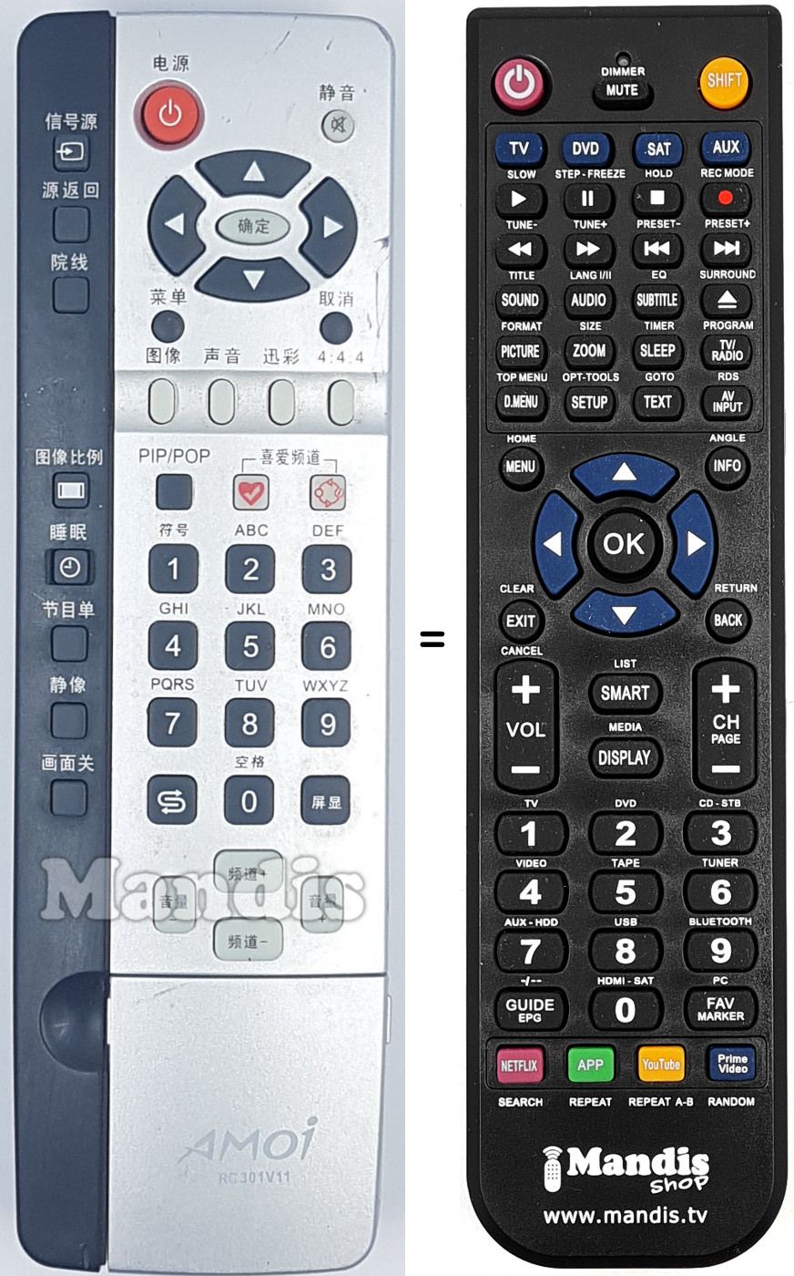 La télécommande équivalente exécute toutes les fonctions, même lorsque la télécommande d'origine commande divers appareils. Dans la télécommande équivalente, est possible de programmer différents appareils (TV, DVD, SAT et AUX) de manière à pouvoir inclure toutes les fonctions de la télécommande d'origine. Si vous voyez le manuel des touches (instructions de la télécommande), vous pouvez vérifier que toutes les fonctions sont présentes.