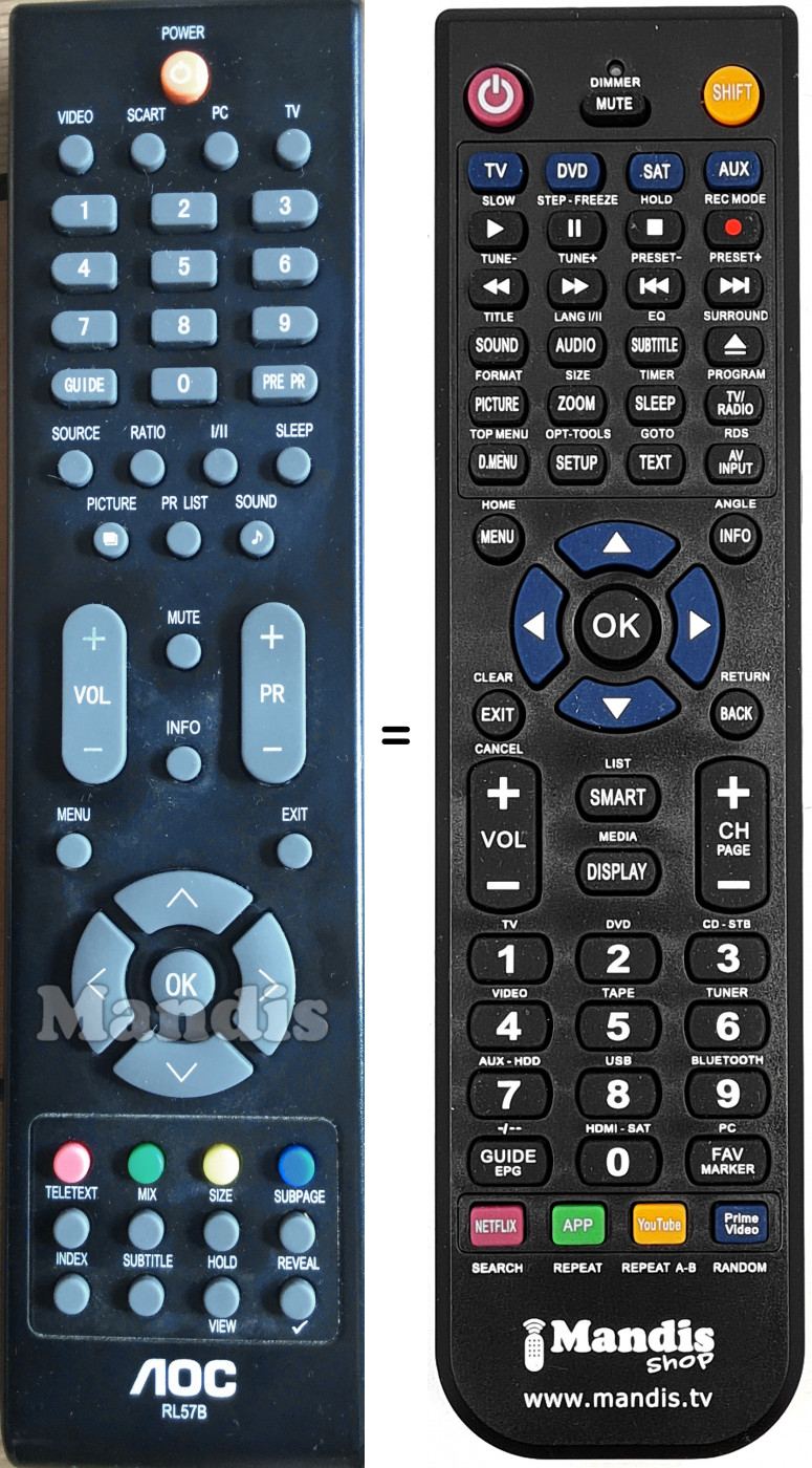 Télécommande qui remplace la télécommande d'origine RL57B car elle possède les mêmes fonctions.