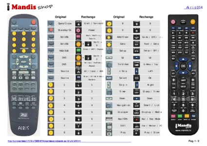 ![]() | 25 novembre 2025 Il est possible d'afficher la notice interactive des touches de la télécommande équivalente Airis014. |