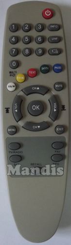 Power, 1, 2, 3, 4, 5, 6, 7, 8, 9, 0, Info, UHF, Audio L/R, White/Fav Down, Yellow/FAV Up, Red/Text, Green/SAT/TV, Blue/Pause, Mute, Up/CH+, Down/CH-, ↓/Vol+, ↑/Vol-, OK, Menu, Exit, Tv/Radio, FAV, SAT, EPG, Recall