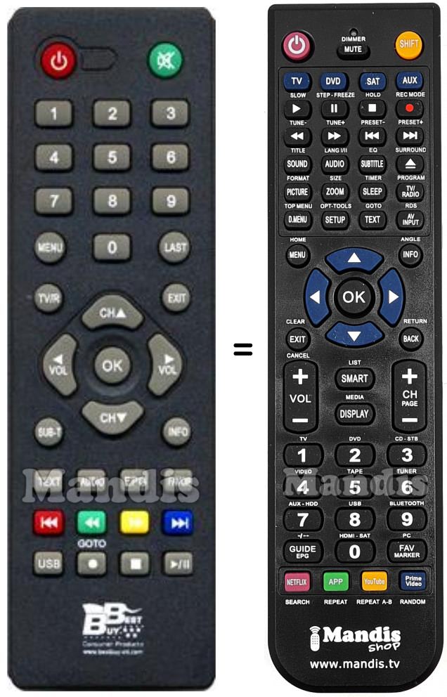 Ci-dessous, nous vous montrerons la correspondance entre chaque bouton de la télécommande d'origine et le bouton qui effectue la même fonction sur la télécommande de remplacement. Dans certains cas, vous devrez peut-être appuyer sur la touche SHIFT avant d'appuyer sur un autre bouton pour effectuer certaines actions. Ces fonctions supplémentaires sont souvent peu utilisées et sont incluses pour faciliter la compréhension de la télécommande de remplacement, ou parce que la télécommande d'origine comporte plus de boutons que son équivalent.