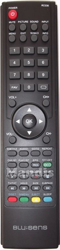 Télécommande d'origine RC036 pour téléviseurs de la marque Blusens. Il s'agit d'un modèle de télécommande d'origine.