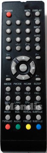 Power, Mute, Display, 1, 2, 3, 4, 5, 6, 7, 8, 9, 0, -/--, Recall, DVB Menu, Input, Auto, LCD Menu, V+, V-, P+, P-, Up, Left, Enter, Right, Down, SMode, PMode, Nicam, Sleep, Fav, Text, Hold, Fav-, Fav+, Info, Lang, EPG, Index, Size, Reveal, Subpage, Red / TV/Radio, Green / Audio, Yellow / Freeze, Blue / Subtitle