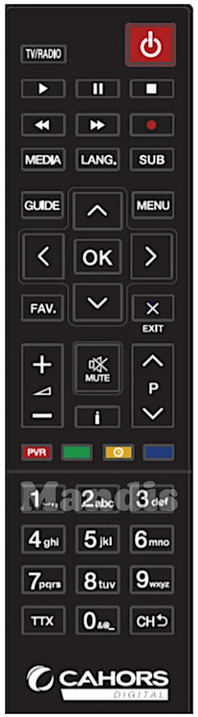 Accueil > Marques > Télécommandes CAHORS > Télécommande pour CAHORS TVS 8100 HD > Répartition interactive des touches CAHORS TVS 8100 HD