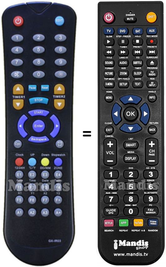 Ci-dessous, nous vous montrerons la correspondance entre chaque bouton de la télécommande d'origine et le bouton qui effectue la même fonction sur la télécommande de remplacement. Dans certains cas, vous devrez peut-être appuyer sur la touche SHIFT avant d'appuyer sur un autre bouton pour effectuer certaines actions. Ces fonctions supplémentaires sont souvent peu utilisées et sont incluses pour faciliter la compréhension de la télécommande de remplacement, ou parce que la télécommande d'origine comporte plus de boutons que son équivalent.