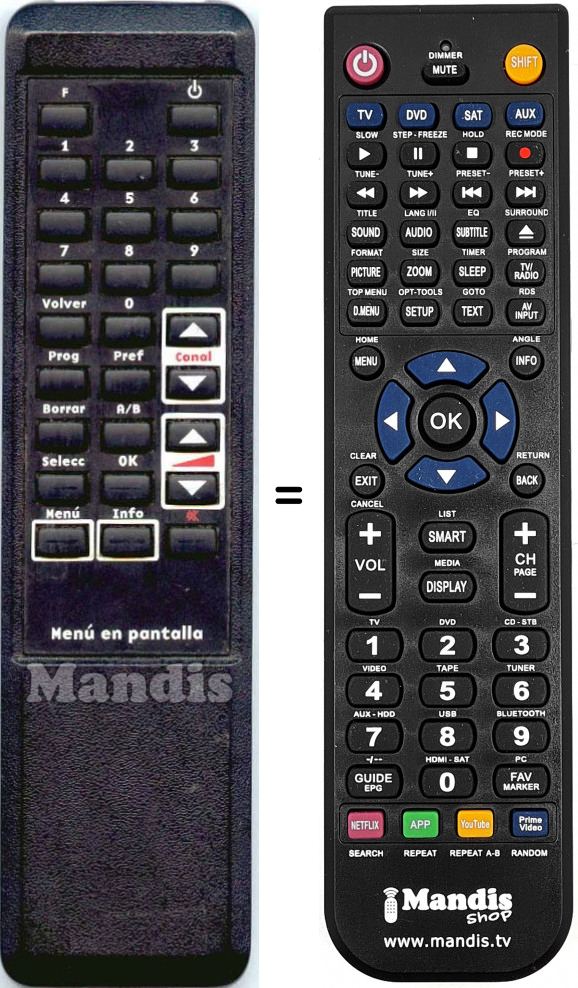 Télécommande qui remplace celle d'origine car elle possède les mêmes fonctions. Il ne s'agit pas d'une télécommande universelle mais d'une télécommande qui remplace celle d'origine. Vous recevrez la télécommande prête à fonctionner, vous n'aurez qu'à mettre les piles. Il n'est pas nécessaire de la programmer. Nous vous garantissons que la télécommande aura exactement les mêmes fonctions que celle d'origine.