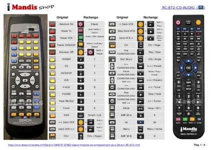 Cette télécommande remplace entièrement votre RC-872 et offre toutes les fonctions de l'originale.