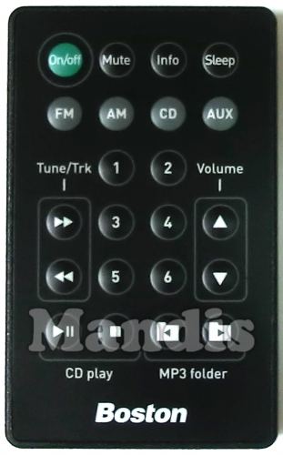 On / Off, Mute, Info, Sleep, FM, AM, CD, AUX, 1, 2, 3, 4, 5, 6, >> / Tune + / Trk +, << / Tune - / Trk -, Volume +, Volume -, CD Play / Pause, CD Stop, MP3 folder -, MP3 folder +