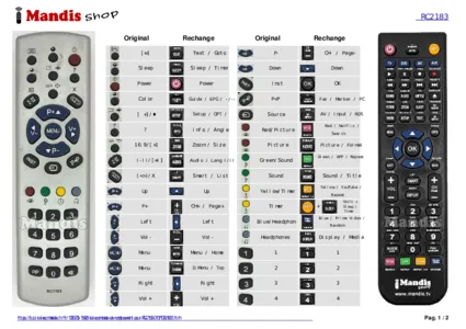 Cette télécommande remplace entièrement votre RC 2183 (313P10821831) et offre toutes les fonctions de l'originale.