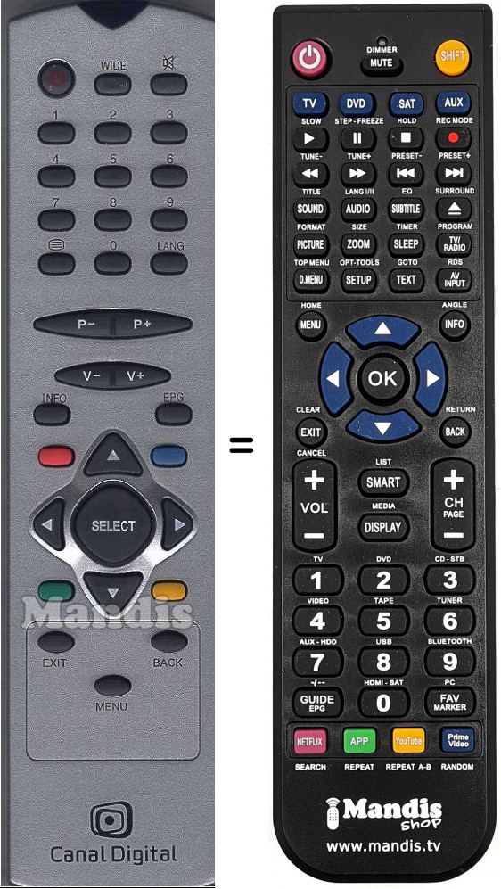 Télécommande qui remplace la télécommande d'origine Canal Digital car elle possède les mêmes fonctions.