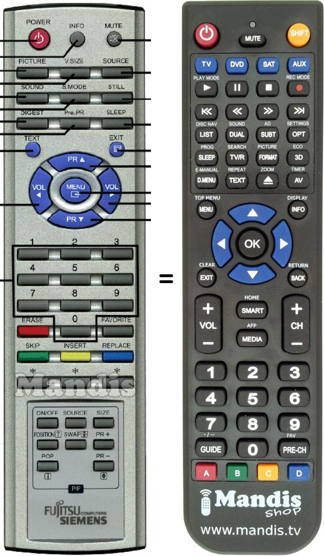 Power, Info, Mute, Picture, V.Size, Source, Sound, S.Mode, Still, Digest, Pre.PR, Sleep, Text, Exit, Up / PR+, Down / PR-, Right / Vol+, Left / Vol-, Menu, 1, 2, 3, 4, 5, 6, 7, 8, 9, 0, Favorite, Red / Erase, Green / Skip, Yellow / Insert, Blue / Replace, *, *, *, PIP On/Off, PIP Source, PIP Size, PIP Position, PIP Swap, PIP POP, PIP PR+, PIP PR-