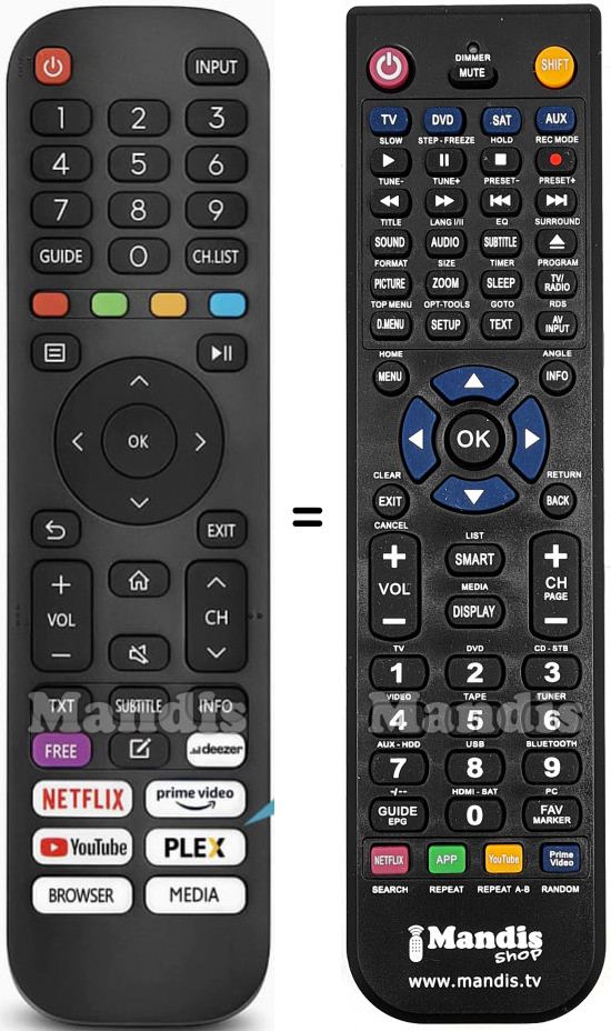 Power, Input, 1, 2, 3, 4, 5, 6, 7, 8, 9, 0, Guide, CH.List, Red, Green, Yellow, Blue, [=], Play/Pause, Exit, Back, Up, Down, Right, Left, OK, Home, Mute, TXT, Subtitle, Info, [ '], Free, deezer, prime video, Netflix, YouTube, Plex, Media, Browser, Vol+, Vol-, CH+, CH-