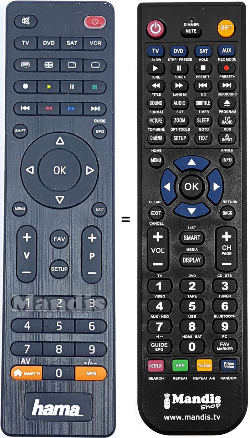 La télécommande équivalente exécute toutes les fonctions, même lorsque la télécommande d'origine commande divers appareils. Dans la télécommande équivalente, est possible de programmer différents appareils (TV, DVD, SAT et AUX) de manière à pouvoir inclure toutes les fonctions de la télécommande d'origine. Si vous voyez le manuel des touches (instructions de la télécommande), vous pouvez vérifier que toutes les fonctions sont présentes.