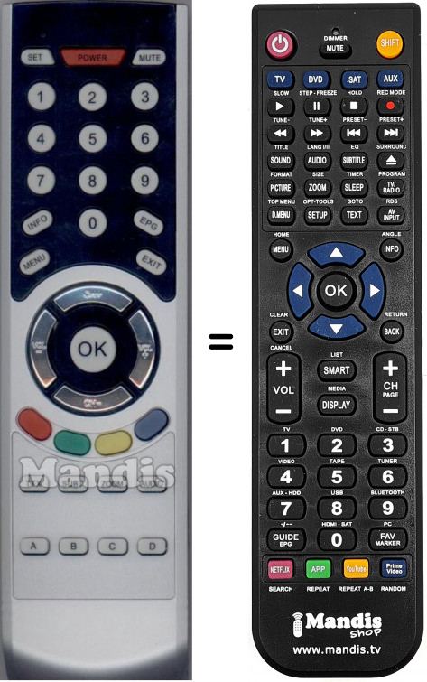 Télécommande qui remplace celle d'origine car elle possède les mêmes fonctions.