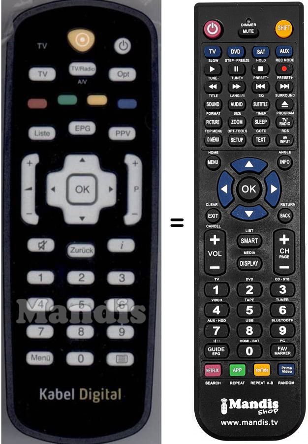 Télécommande qui remplace la télécommande d'origine KabelDigital (014350080) car elle possède les mêmes fonctions.