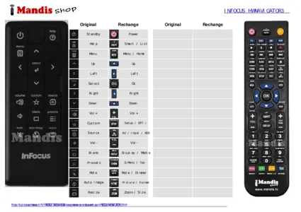 Cette télécommande remplit toutes les fonctions de la télécommande d'origine: Power, Help, Menu, Up, Down, Right, Left, Select, Vol+, Vol-, Mute, Custom, Source, Blank, Presets, Auto Image, Resize