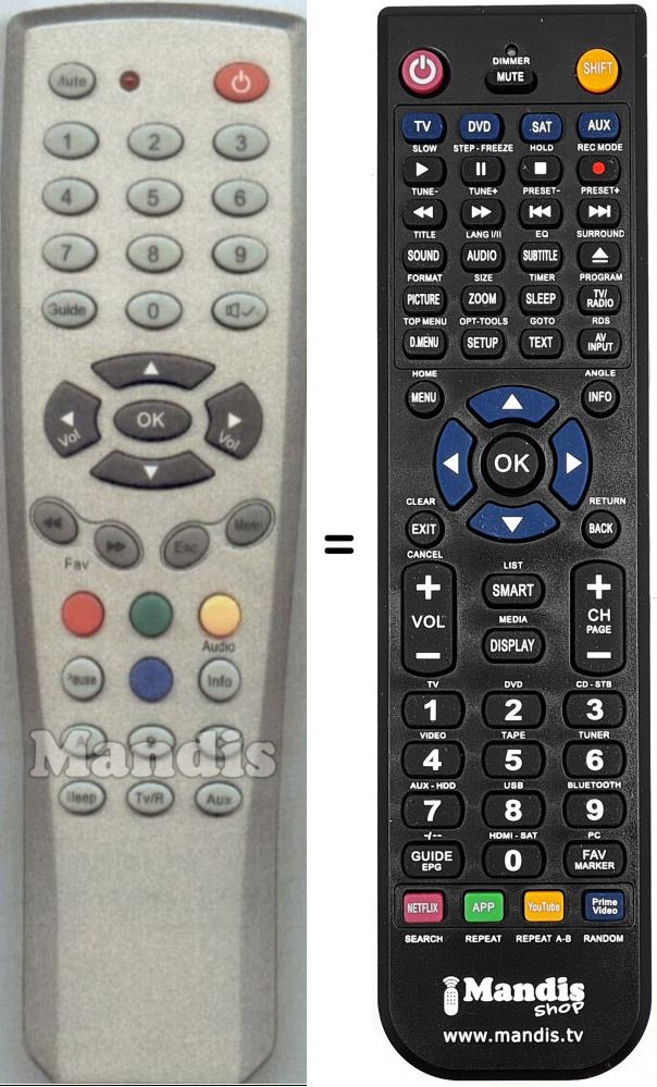 Télécommande qui remplace celle d'origine car elle possède les mêmes fonctions.
