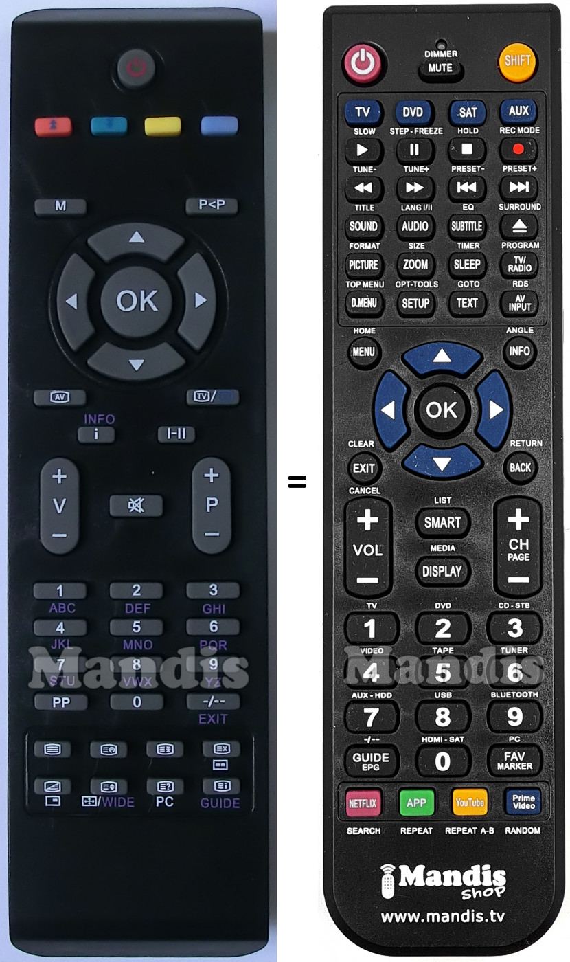 Ci-dessous, nous vous montrerons la correspondance entre chaque bouton de la télécommande d'origine et le bouton qui effectue la même fonction sur la télécommande de remplacement. Dans certains cas, vous devrez peut-être appuyer sur la touche SHIFT avant d'appuyer sur un autre bouton pour effectuer certaines actions. Ces fonctions supplémentaires sont souvent peu utilisées et sont incluses pour faciliter la compréhension de la télécommande de remplacement, ou parce que la télécommande d'origine comporte plus de boutons que son équivalent.