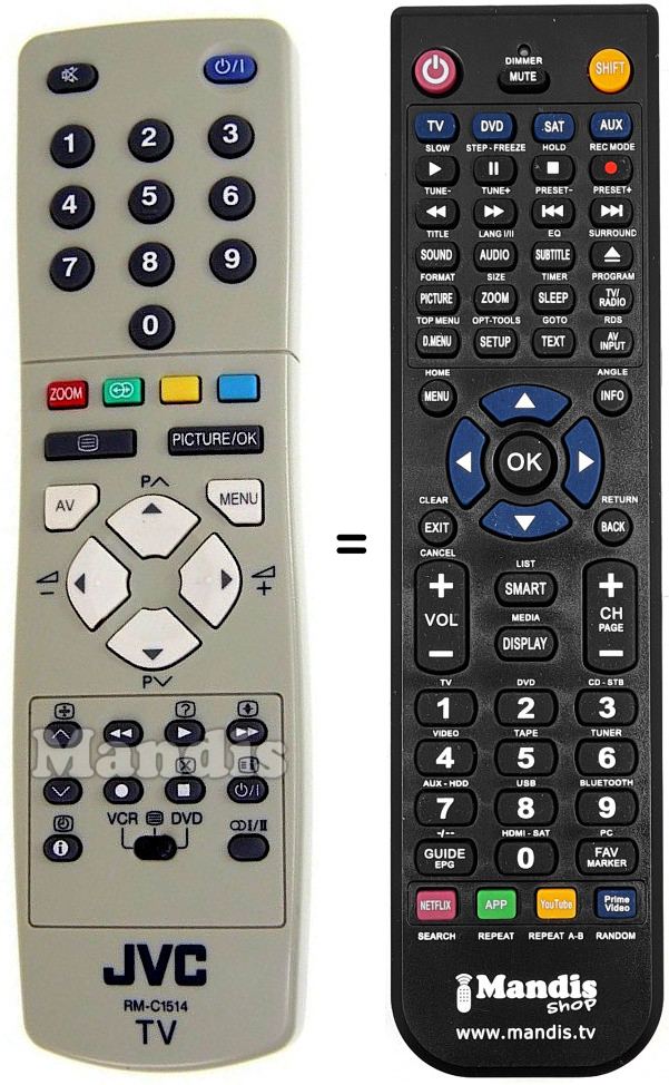 Télécommande qui remplace la télécommande d'origine RM-C1514 (BE5F2602W001) car elle possède les mêmes fonctions.