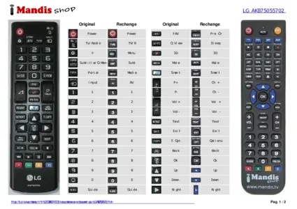 Cette télécommande remplit toutes les fonctions de la télécommande d'origine: Power, TV / Rad, Subtitle, AV Mode, Ratio, Input, 1, 2, 3, 4, 5, 6, 7, 8, 9, 0, List, Q.View, Vol +, Vol -, Fav, Guide, Mute, P+ / Page +, P- / Page -, Text, Info, T.Opt, Settings, Q.Menu, Up, Right, Down, Left, OK, Back, Exit, Simplink, AD, Stop, <<, Play, Pause, >>, Red, Green, Yellow, Blue