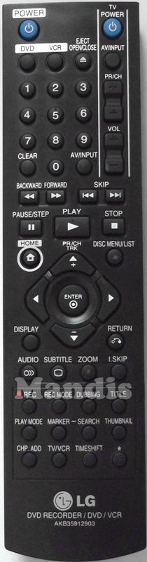 Power, DVD, VCR, Eject/Open/Close, 1, 2, 3, 4, 5, 6, 7, 8, 9, Power Tv, AV/Input Tv, PR/CH+ Tv, PR/CH- Tv, Vol+ Tv, Vol- Tv, Clear, 0, AV/Input, <<, >>, I<<, >>I, Pause/Step, Play, Stop, Home, Disc Menu/List, Up/PR/CH/TRK+, Down/PR/CH/TRK-, Left, Right, Enter, Display, Return, O))/Audio, [...]/Subtitle, Zoom, I.Skip, Rec, Rec Mode, Dubbing, Title, Play Mode, Marker, Search, Thumbnail, CHP.ADD, TV/VCR, Timeshift, *