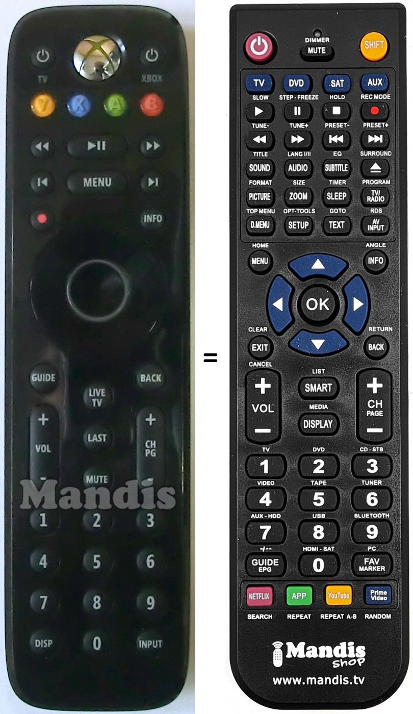 Ci-dessous, nous vous montrerons la correspondance entre chaque bouton de la télécommande d'origine et le bouton qui effectue la même fonction sur la télécommande de remplacement. Dans certains cas, vous devrez peut-être appuyer sur la touche SHIFT avant d'appuyer sur un autre bouton pour effectuer certaines actions. Ces fonctions supplémentaires sont souvent peu utilisées et sont incluses pour faciliter la compréhension de la télécommande de remplacement, ou parce que la télécommande d'origine comporte plus de boutons que son équivalent.