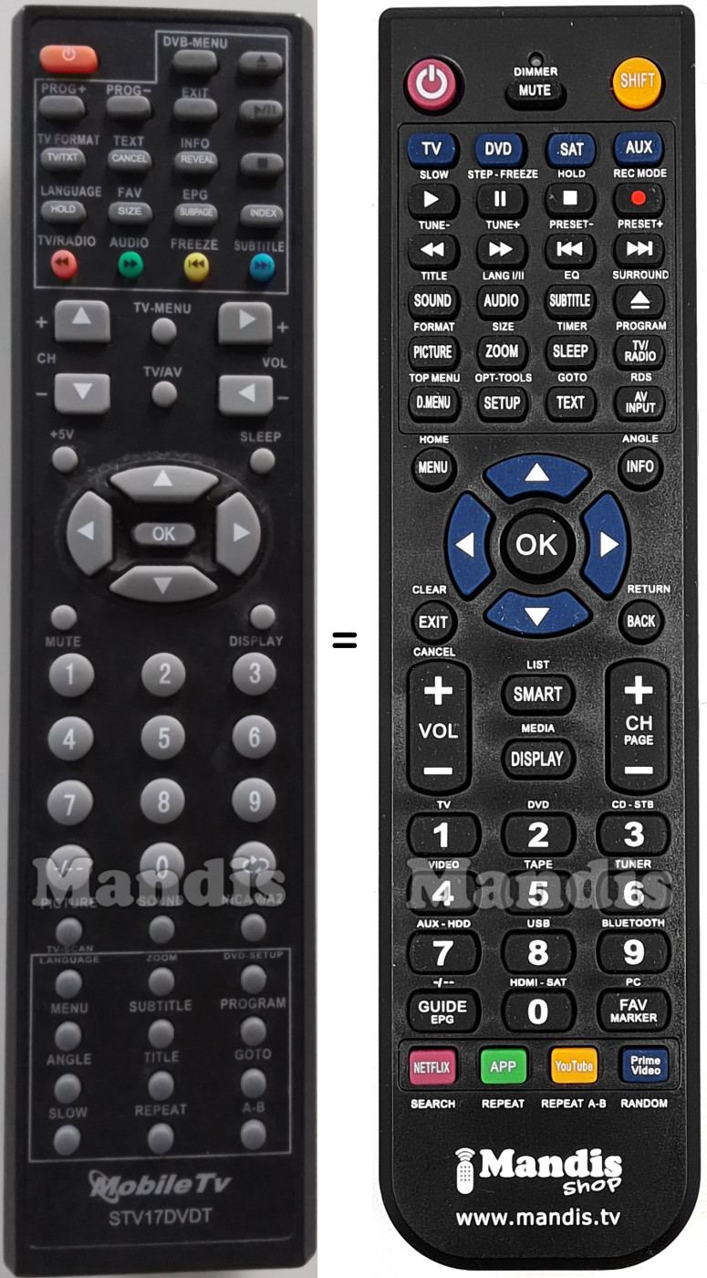 Cette télécommande remplace entièrement votre STV17DVDT-1 et offre toutes les fonctions de l'originale.