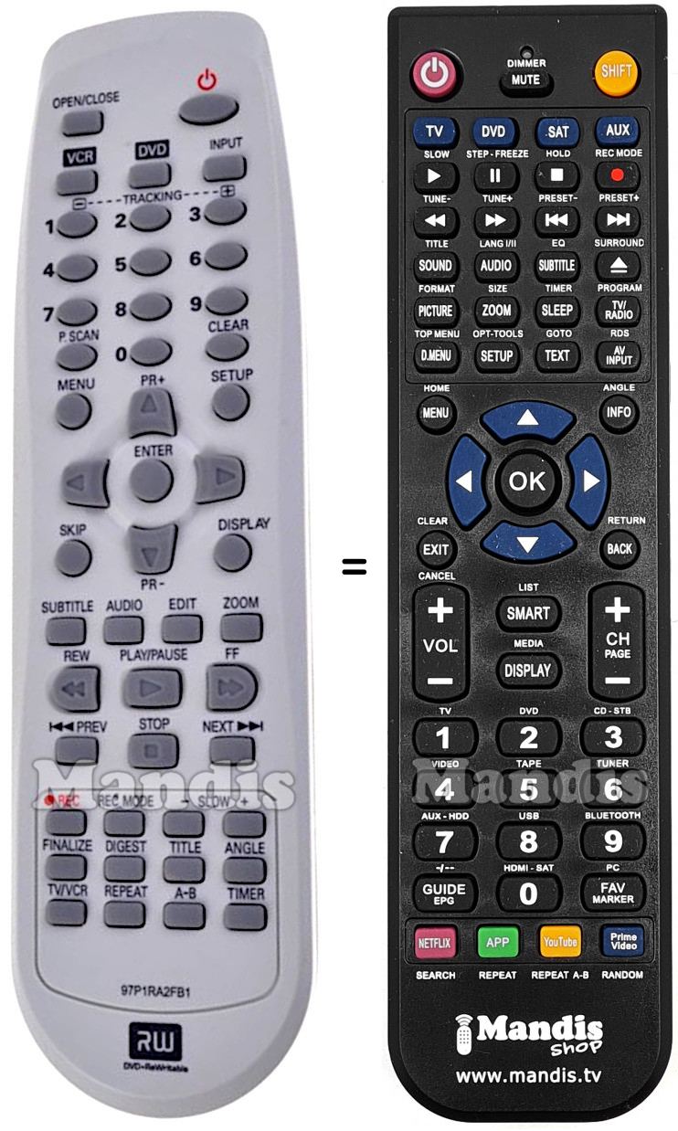 Cette télécommande remplace la plupart des fonctions de votre 97P1RA2FB1. Il ne s'agit pas d'une télécommande universelle, mais d'une copie avec la plupart des touches et des fonctions de votre télécommande d'origine.