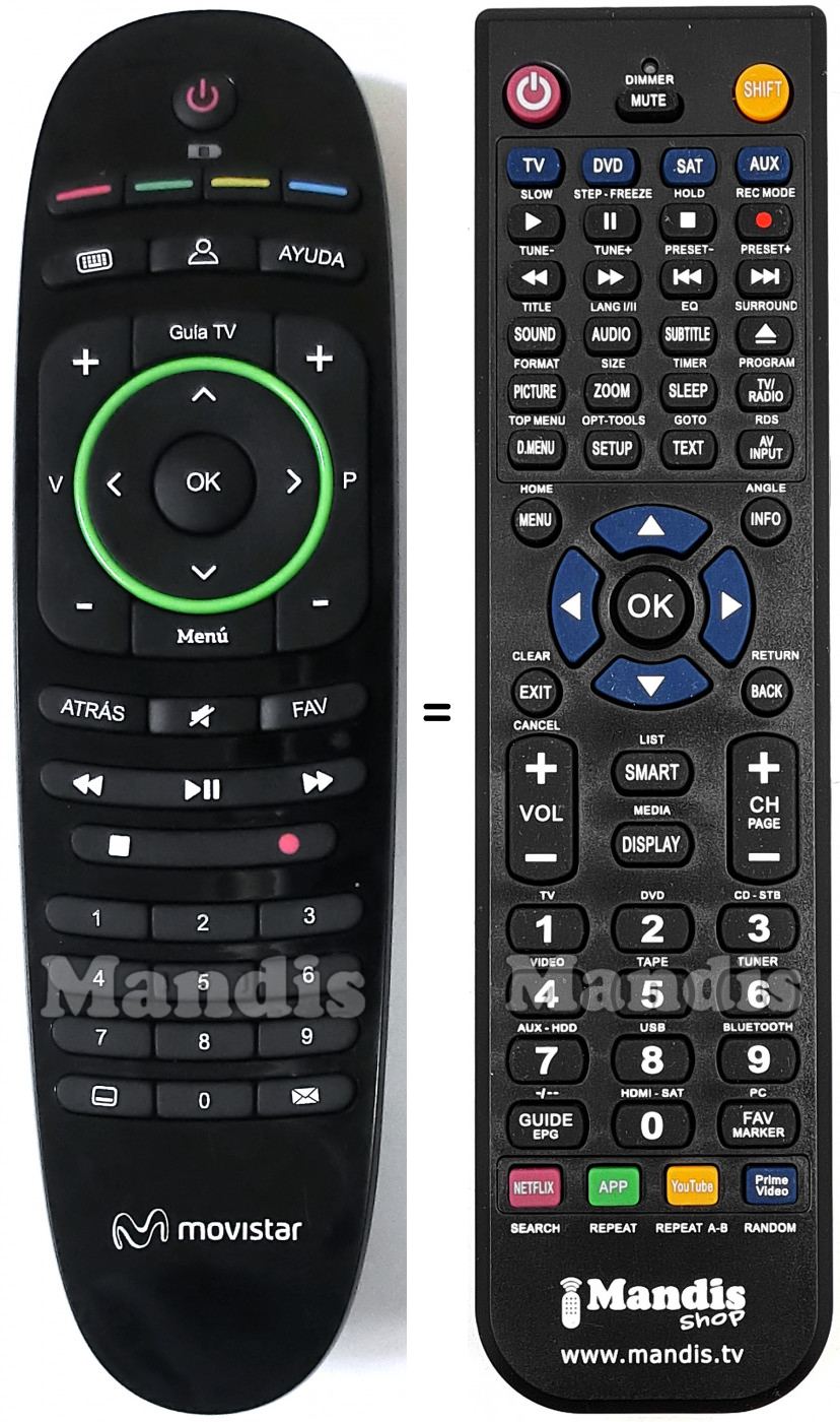 Ci-dessous, nous vous montrerons la correspondance entre chaque bouton de la télécommande d'origine et le bouton qui effectue la même fonction sur la télécommande de remplacement. Dans certains cas, vous devrez peut-être appuyer sur la touche SHIFT avant d'appuyer sur un autre bouton pour effectuer certaines actions. Ces fonctions supplémentaires sont souvent peu utilisées et sont incluses pour faciliter la compréhension de la télécommande de remplacement, ou parce que la télécommande d'origine comporte plus de boutons que son équivalent.