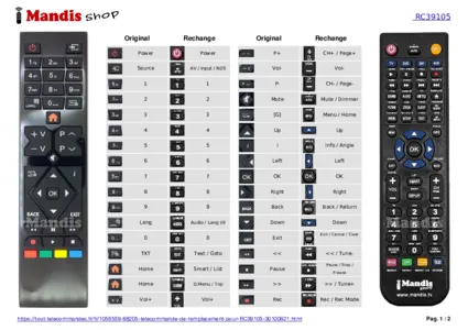 Cette télécommande remplace entièrement votre RC39105 (30100821) et offre toutes les fonctions de l'originale.