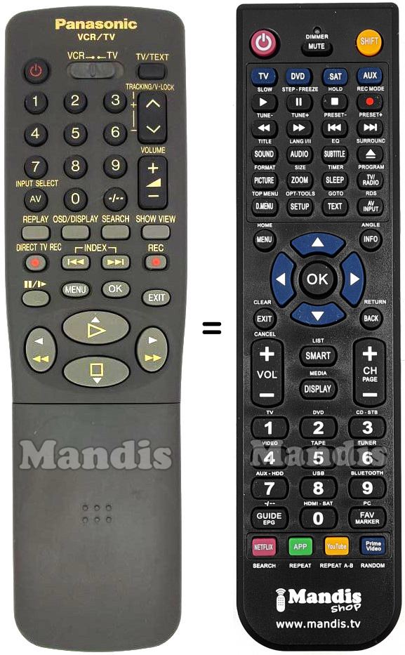 Cette télécommande remplit toutes les fonctions de la télécommande d'origine: Power, Tv/Text, 1, 2, 3, 4, 5, 6, 7, 8, 9, 0, AV/Input Select, Tracking/V-Lock+, Tracking/V-Lock-, Vol+, Vol-, -/--, Replay, OSD/Display, Search, Show View, Direct Tv Rec, I<<, >>I, Rec, Pause/Step, Menu, OK, Exit, Play/Up, Stop/Down, >>/Right, <</Left, Prog/Check+, Prog/Check-, Date+, Date-, On+, On-, Off+, Off-, Prog/Check, Cancel, Nothing1, Timer Rec, Reset, Nothing2, Nothing3, VPS/PDC, AV Link, Tv Aspect