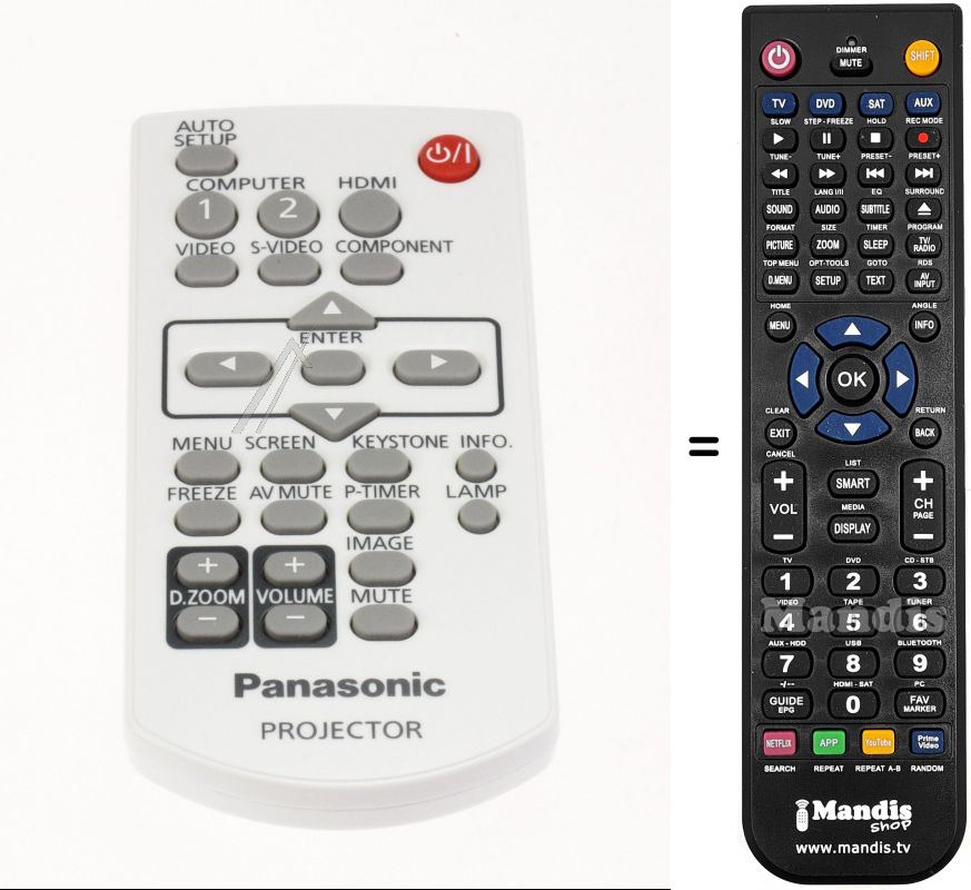 Ci-dessous, nous vous montrerons la correspondance entre chaque bouton de la télécommande d'origine et le bouton qui effectue la même fonction sur la télécommande de remplacement. Dans certains cas, vous devrez peut-être appuyer sur la touche SHIFT avant d'appuyer sur un autre bouton pour effectuer certaines actions. Ces fonctions supplémentaires sont souvent peu utilisées et sont incluses pour faciliter la compréhension de la télécommande de remplacement, ou parce que la télécommande d'origine comporte plus de boutons que son équivalent.