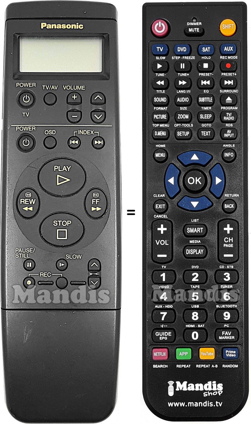 Ci-dessous, nous vous montrerons la correspondance entre chaque bouton de la télécommande d'origine et le bouton qui effectue la même fonction sur la télécommande de remplacement. Dans certains cas, vous devrez peut-être appuyer sur la touche SHIFT avant d'appuyer sur un autre bouton pour effectuer certaines actions. Ces fonctions supplémentaires sont souvent peu utilisées et sont incluses pour faciliter la compréhension de la télécommande de remplacement, ou parce que la télécommande d'origine comporte plus de boutons que son équivalent.