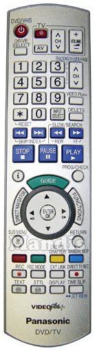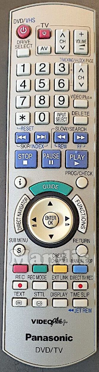 DVD/VHS Power, TV Power, TV AV, TV CH+, TV CH-, TV Volume+, TV Volume-, Drive Select, 1, 2, 3, 4, 5, 6, 7, 8, 9, 0, * / Reset, Input Select, CH + Tracking/V-Lock +, CH - Tracking/V-Lock -, VIDEO Plus+, Delete, I<< Skip/Index, >>I Skip/Index, << REW, >> FF, Stop, Pause, Play, i, Prog/Check, Guide, Direct Navigator, Functions, Up, Left / <II, Enter / OK, Down, Right 7 II>, Sub Menu, Return, Red, Green, Yellow / Create Chapter, Blue / Manual Skip, Rec, Rec Mode, Ext Link, Direct TV Rec, Text, STTL, Display, Time Slip / << Jet Rew