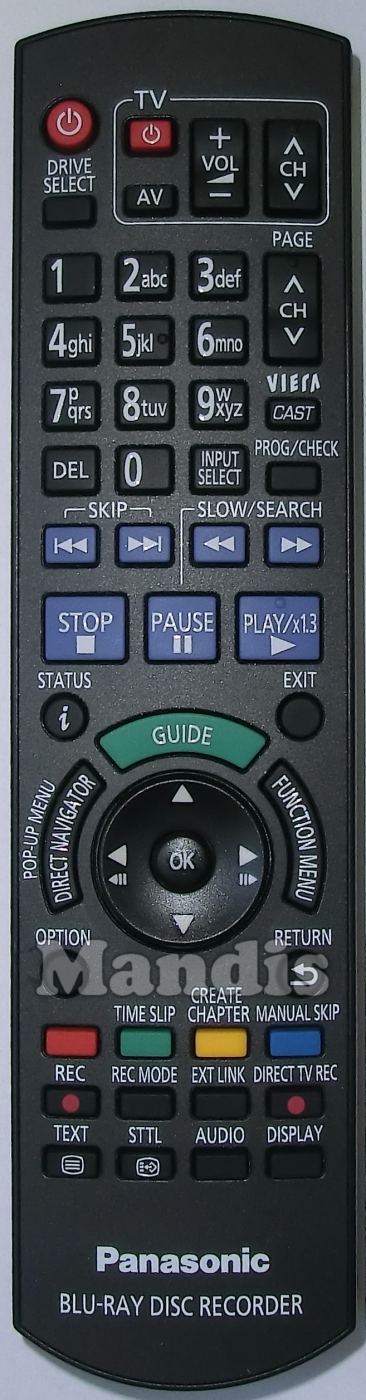TV Power, TV AV, TV Vol +, TV Vol -, TV CH +, TV CH -, Power, Drive Select, 1, 2, 3, 4, 5, 6, 7, 8, 9, 0, Ch + / Page +, Ch - / Page -, Cast / Viera, Del, Input Select, Prog / Check, I<<, >>I, <<, >>, Stop, Pause, Play / x1.3, i / Status, Exit, Guide, Direct Navigator / Pop-Up Menu, Function Menu, Up, Right, Down, Left, OK, Option, Return, Red, Green / Time Slip, Yellow / Create Chapter, Blue / Manual Skip, Rec, Rec Mode, Exit Link, Direct TV Rec, Text, STTL, Audio, Display