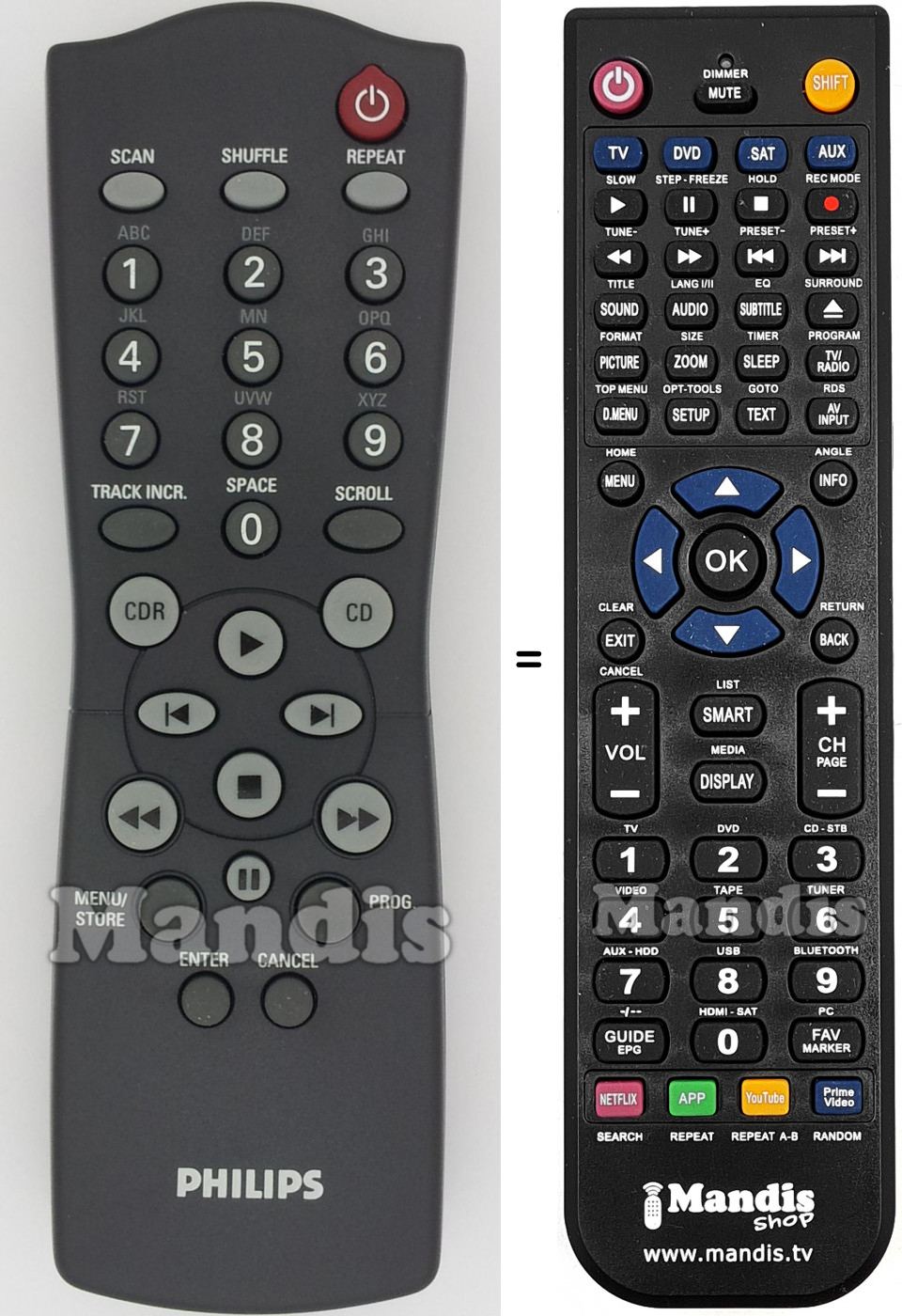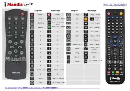 Cette télécommande remplit toutes les fonctions de la télécommande d'origine: power, scan, shuffle, repeat, 1, 2, 3, 4, 5, 6, 7, 8, 9, 0, track incr., scroll, cdr, cd, <<, >>, play, stop, >i, i<, menu/store, prog., pause, enter, cancel
