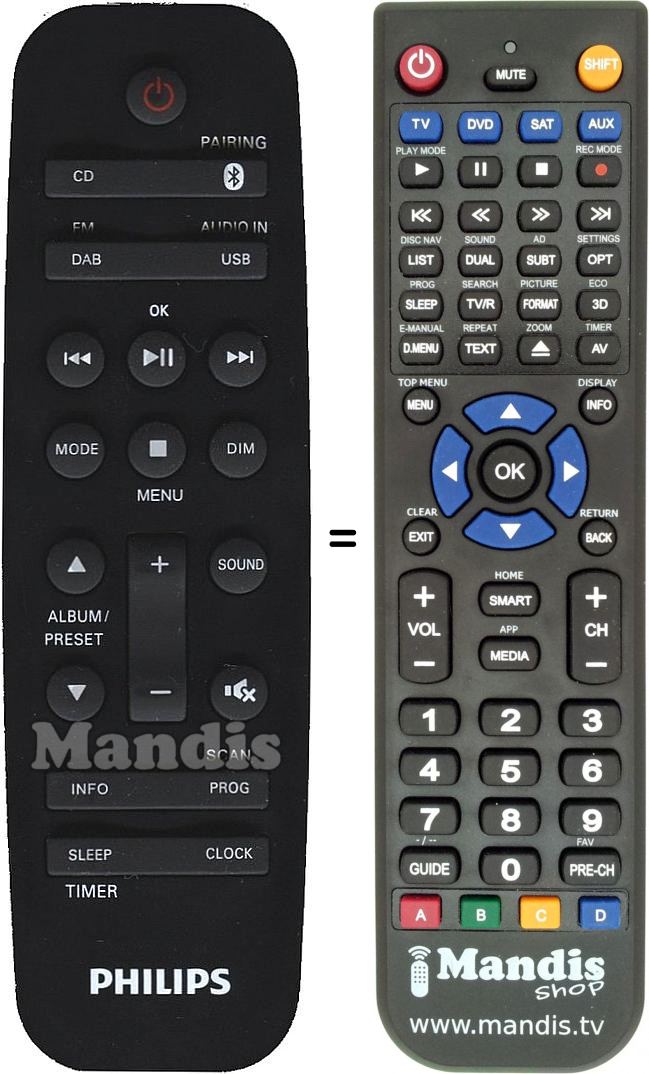 Ci-dessous, nous vous montrerons la correspondance entre chaque bouton de la télécommande d'origine et le bouton qui effectue la même fonction sur la télécommande de remplacement. Dans certains cas, vous devrez peut-être appuyer sur la touche SHIFT avant d'appuyer sur un autre bouton pour effectuer certaines actions. Ces fonctions supplémentaires sont souvent peu utilisées et sont incluses pour faciliter la compréhension de la télécommande de remplacement, ou parce que la télécommande d'origine comporte plus de boutons que son équivalent.