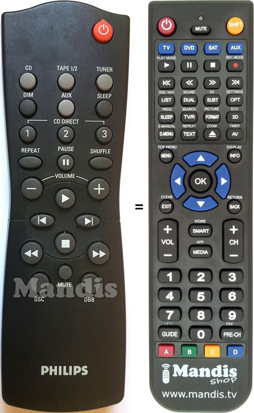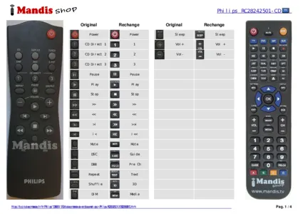 Cette télécommande remplit toutes les fonctions de la télécommande d'origine: Power, DIM, Sleep, CD Direct 1, CD Direct 2, CD Direct 3, Pause, Repeat, Shuffle, Vol-, Vol+, Play, I<, >I, Stop, <<, >>, DSC, DBB, Mute