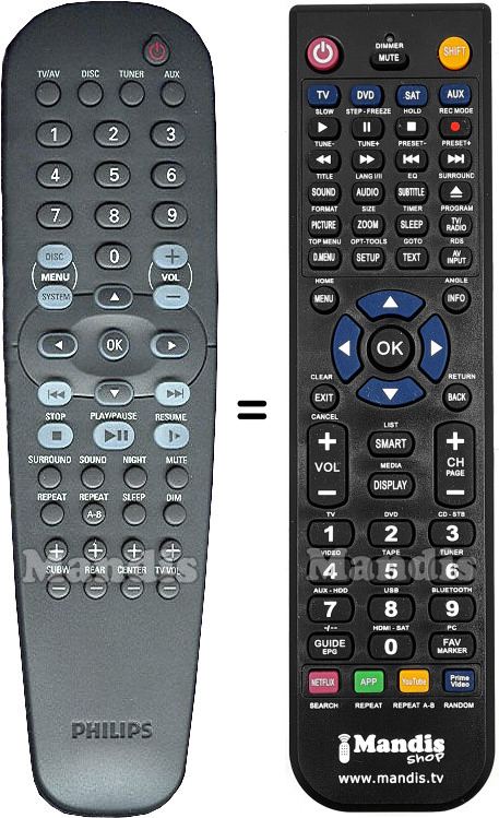 Ci-dessous, nous vous montrerons la correspondance entre chaque bouton de la télécommande d'origine et le bouton qui effectue la même fonction sur la télécommande de remplacement. Dans certains cas, vous devrez peut-être appuyer sur la touche SHIFT avant d'appuyer sur un autre bouton pour effectuer certaines actions. Ces fonctions supplémentaires sont souvent peu utilisées et sont incluses pour faciliter la compréhension de la télécommande de remplacement, ou parce que la télécommande d'origine comporte plus de boutons que son équivalent.