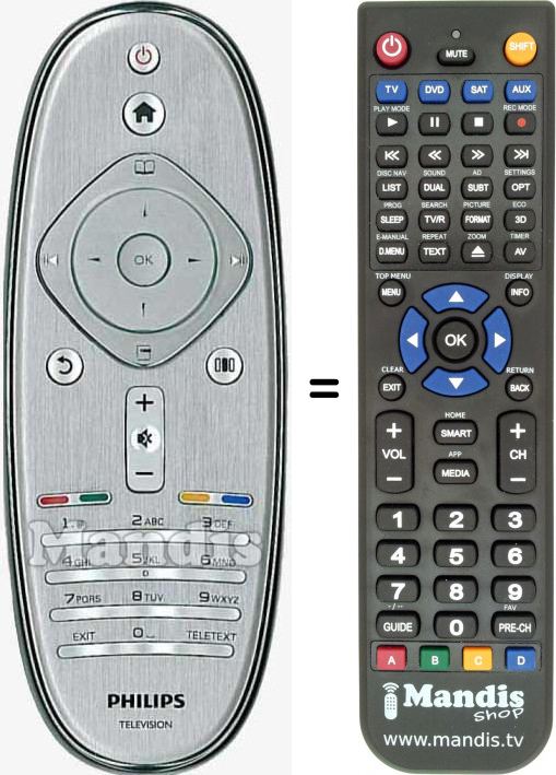 Ci-dessous, nous vous montrerons la correspondance entre chaque bouton de la télécommande d'origine et le bouton qui effectue la même fonction sur la télécommande de remplacement. Dans certains cas, vous devrez peut-être appuyer sur la touche SHIFT avant d'appuyer sur un autre bouton pour effectuer certaines actions. Ces fonctions supplémentaires sont souvent peu utilisées et sont incluses pour faciliter la compréhension de la télécommande de remplacement, ou parce que la télécommande d'origine comporte plus de boutons que son équivalent.