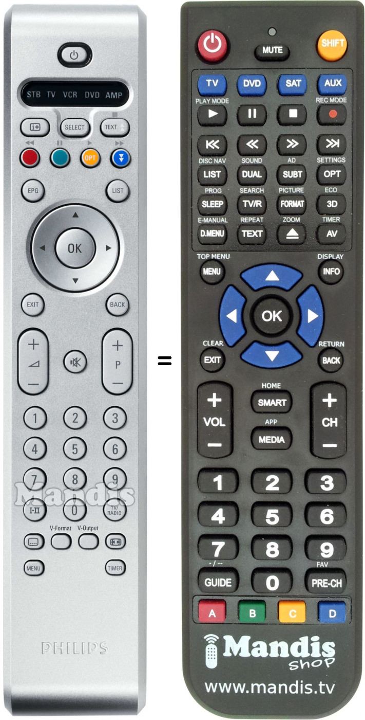 Ci-dessous, nous vous montrerons la correspondance entre chaque bouton de la télécommande d'origine et le bouton qui effectue la même fonction sur la télécommande de remplacement. Dans certains cas, vous devrez peut-être appuyer sur la touche SHIFT avant d'appuyer sur un autre bouton pour effectuer certaines actions. Ces fonctions supplémentaires sont souvent peu utilisées et sont incluses pour faciliter la compréhension de la télécommande de remplacement, ou parce que la télécommande d'origine comporte plus de boutons que son équivalent.