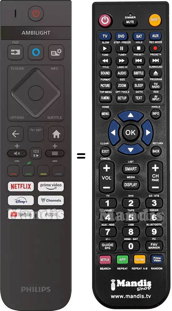 Ci-dessous, nous vous montrerons la correspondance entre chaque bouton de la télécommande d'origine et le bouton qui effectue la même fonction sur la télécommande de remplacement. Dans certains cas, vous devrez peut-être appuyer sur la touche SHIFT avant d'appuyer sur un autre bouton pour effectuer certaines actions. Ces fonctions supplémentaires sont souvent peu utilisées et sont incluses pour faciliter la compréhension de la télécommande de remplacement, ou parce que la télécommande d'origine comporte plus de boutons que son équivalent.