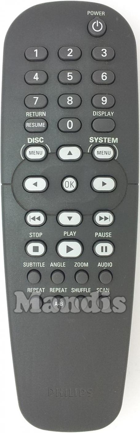 Power, 1, 2, 3, 4, 5, 6, 7, 8, 9, Resume/Return, Display, Disc Menu, System Menu, 0, Up, Down, Right, Left, OK, I<<, >>I, Play, Stop, Pause, Subtitle, Angle, Zoom, Audio, Repeat, A-B Repeat, Shuffle, Scan