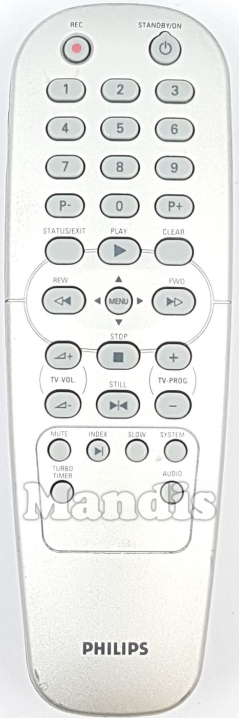 REC, Standby / On, 1, 2, 3, 4, 5, 6, 7, 8, 9, 0, P-, P+, Status / Exit, Clear, Play / Up, ◀◀ REW / Left, Menu, ▶▶ FWD / Right, Stop / Down, TV Vol +, TV Vol -, ▶|◀ Still, TV Prog +, TV Prog -, Mute, ▶| / Index, Slow, System, Turbo Timer, Audio