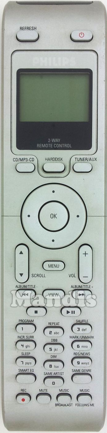 Refresh, Power, CD/,PE3-CD, Harddisk, Tuner/Aux, Up, Down, Left, Right, OK, Scroll+, Scroll-, Menu, Vol+, Vol-, I<</Album/Title-, >>I/Album/Title+, View, Stop, Play/Pause, 1/Program, 2/Repeat, 3/Shuffle, 4/INCR.SURR, 5/DBB, 6/Mark/Unmark, 7/Sleep, 8/DIM, 9/RDS/New, 0/Same Artist, Smart EQ, Same Genre, Rec, Mute, Music/Broadcast, Music/Follows Me